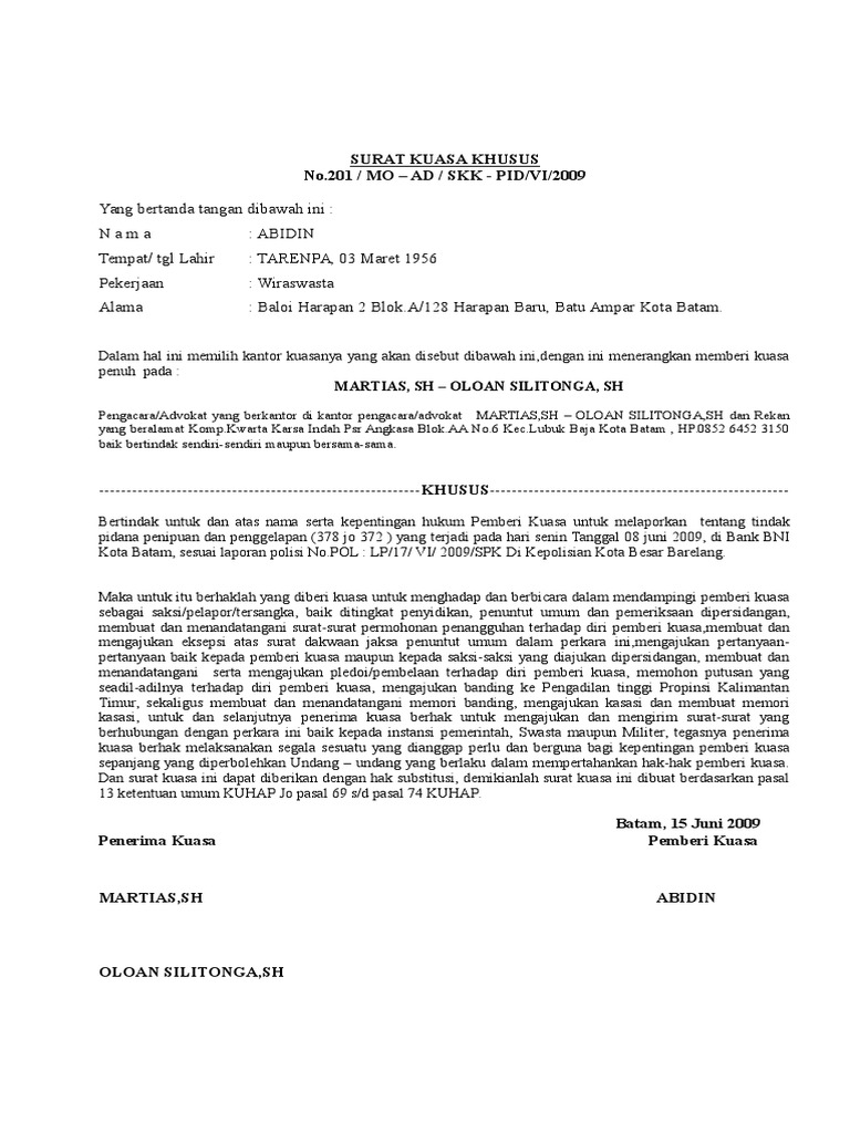 Surat kuasa khusus meliputi kegiatan tertentu yang dialihkan ke penerima kuasa. Surat kuasa istimewa adalah surat kuasa yang dibuat atau diterbitkan oleh perseorangan atau lembaga tertentu kepada pihak hukum, biasanya isinya mengenai urusan advokat untuk menyelesaikan permasalahan yang berkaitan dengan hukum, pengadilan, dan peradilan. Contoh surat kuasa pengacara untuk kepengurusan hukum contoh surat kuasa pengambilan uang di bank bni, mandiri, bca, bri Surat kuasa merupakan dokumen tertulis yang dibutuhkan dalam melakukan hal atau tindakan oleh penerima kuasa untuk bertindak mewakili pihak pemberi kuasa. Download contoh surat kuasa bagi advokat untuk perkara pidana yang dapat diunduh secara lengkap dan gratis tanpa perlu daftar.