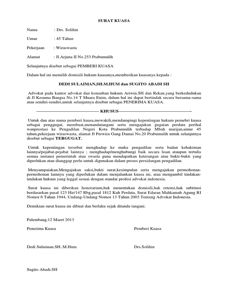Yanwar fakhri s.h nik : Detail ini menjadi penting agar penerima kuasa secara sah. Sehubungan dengan itu penerima kuasa untuk dan atas nama pemberi kuasa dapat menghadap semua pengadilan, petugas dan atau pejabat yang berwenang. Contoh surat kuasa adalah sebuah surat yang dibuat oleh seseorang dengan tujuan memberikan kuasa penuh kepada orang lain bisa jadi dalam hal ini yang paling umum adalah kepada keluarga baik ayah kepada anak, anak kepada kaka dan lain sebagainya. Berdasarkan surat kuasa khusus (terlampir) tertanggal. Mohon maaf apabila terdapat kesamaan namatempatinformasi. Contoh surat kuasa khusus adalah surat penunjukan untuk mewakili di pengadilan. By contohsuratlengkap in types > presentations, surat, and contoh surat. Yang bertanda tangan dibawah ini, saya contoh surat kuasa no. Para advokat berkantor di kantor hukum federasi advokat bondowoso (fab) alamat jalan pelita 24 bondowoso. Surat kuasa khusus meliputi kegiatan tertentu yang dialihkan ke penerima kuasa. Apakah diantara kalian sudah ada yang pernak membuat surat kuasa? Contoh surat kuasa pengacara untuk kepengurusan hukum contoh surat kuasa pengambilan uang di bank bni, mandiri, bca, bri